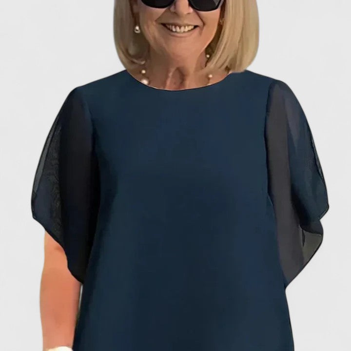 Laura is a set consisting of a top and matching trousers in the same pattern. The top features a button closure at the front and sleeves that extend just below the elbow. The front falls in two parts over the trousers, which is comfortable when moving. The trousers have straight legs and fit nicely without being tight. The set is made from a cotton blend and feels pleasant against the skin.
